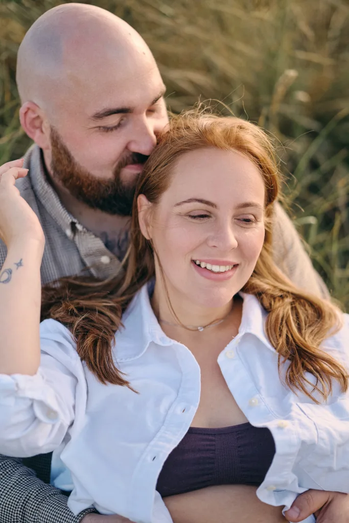 There’s something truly magical about beach maternity photography in Northumberland, especially at golden hour. This session at Seaton Sluice captured the perfect combination of soft, warm sunset light, romantic moments, and relaxed fun.