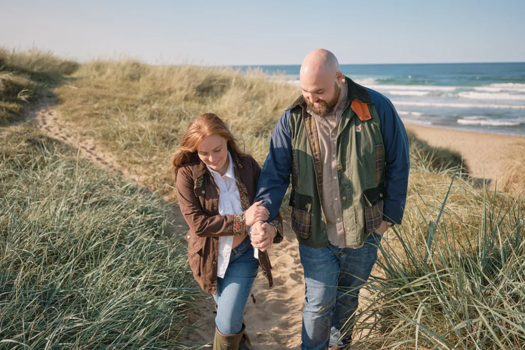 I started the session capturing intimate portraits of this beautiful couple, just them together as they prepare to welcome their little one. The golden light, gentle waves, and soft sand created the perfect backdrop for romantic maternity photography near Newcastle upon Tyne.